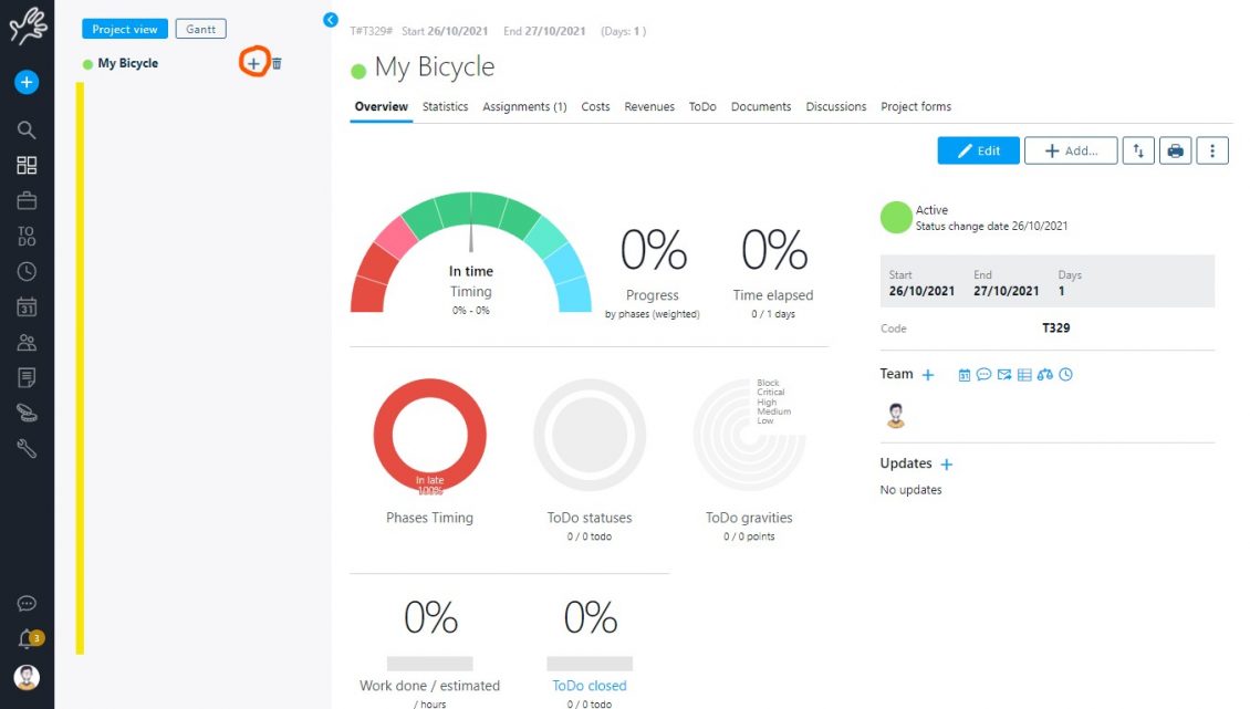 We will create an example project: “My Bicycle”; at this stage we will not worry about dates, resources, types etc. Twproject allows us to create a new project with two clicks: