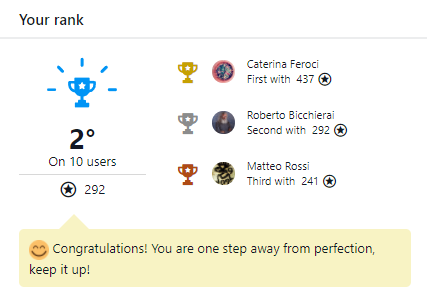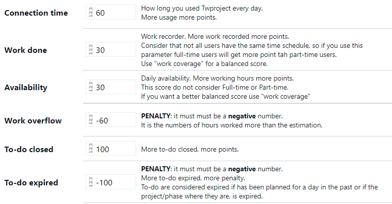 whoever has made the greatest value for a certain indicator takes the “weight”, whoever has made the smallest value still takes some points. Eg: operator “a” has closed 100 ToDo, “b” has closed 30. Since the “weight” for closed ToDo is 100, “a” will take 100, “b” 30.