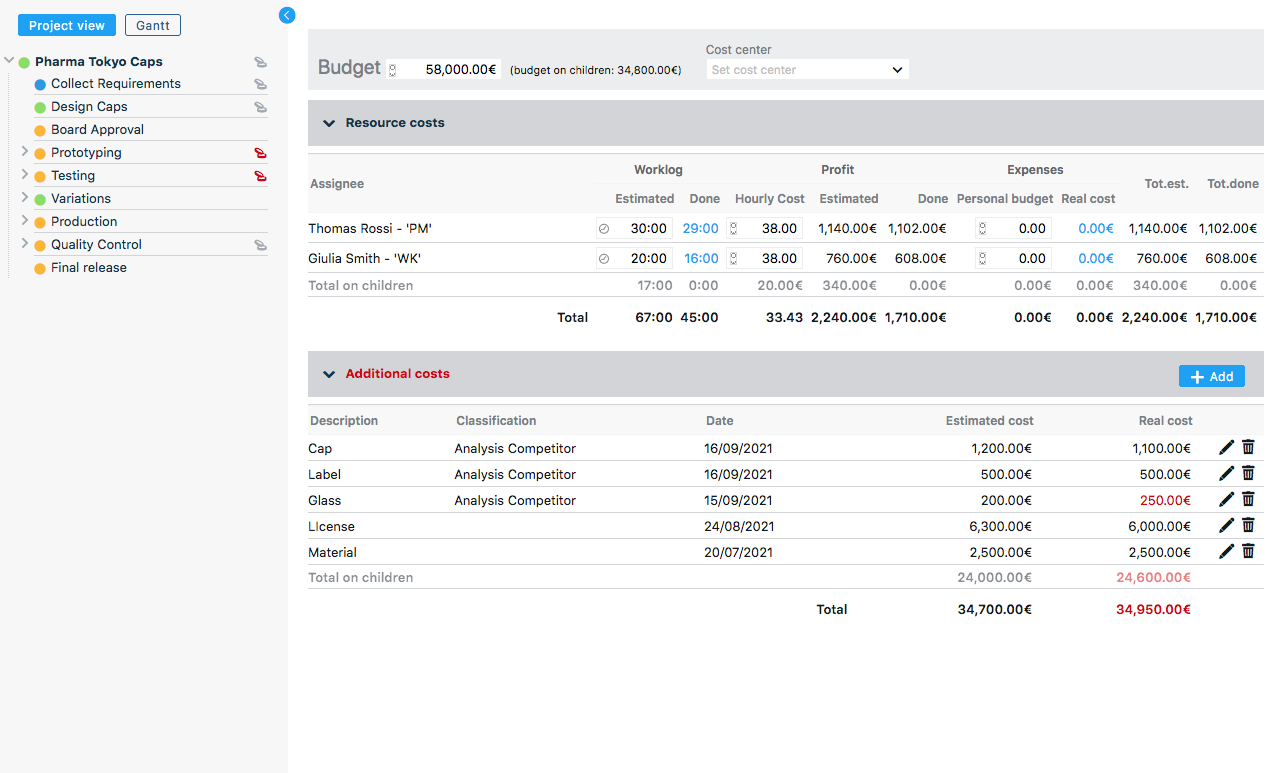 Setup your project structure with ease. The WBS follows you in every project section. Contextual alerts shows you overdue phases or ToDo, costs exceeding or overloaded resources.