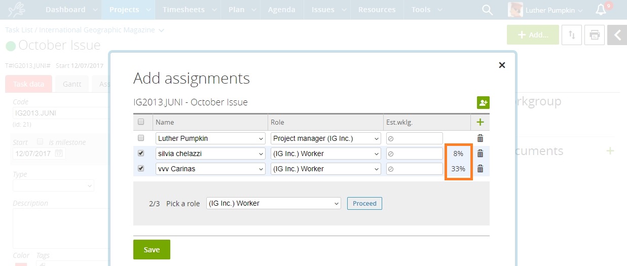 When I insert them the system will ask for a role to pick, I can choose one for all or select row by row, but Twproject will do more than this, Twproject will show you the work load of each resource I select. This information could be crucial, I can use infact this functionality to simply select the writer less loaded in this case Silvia: