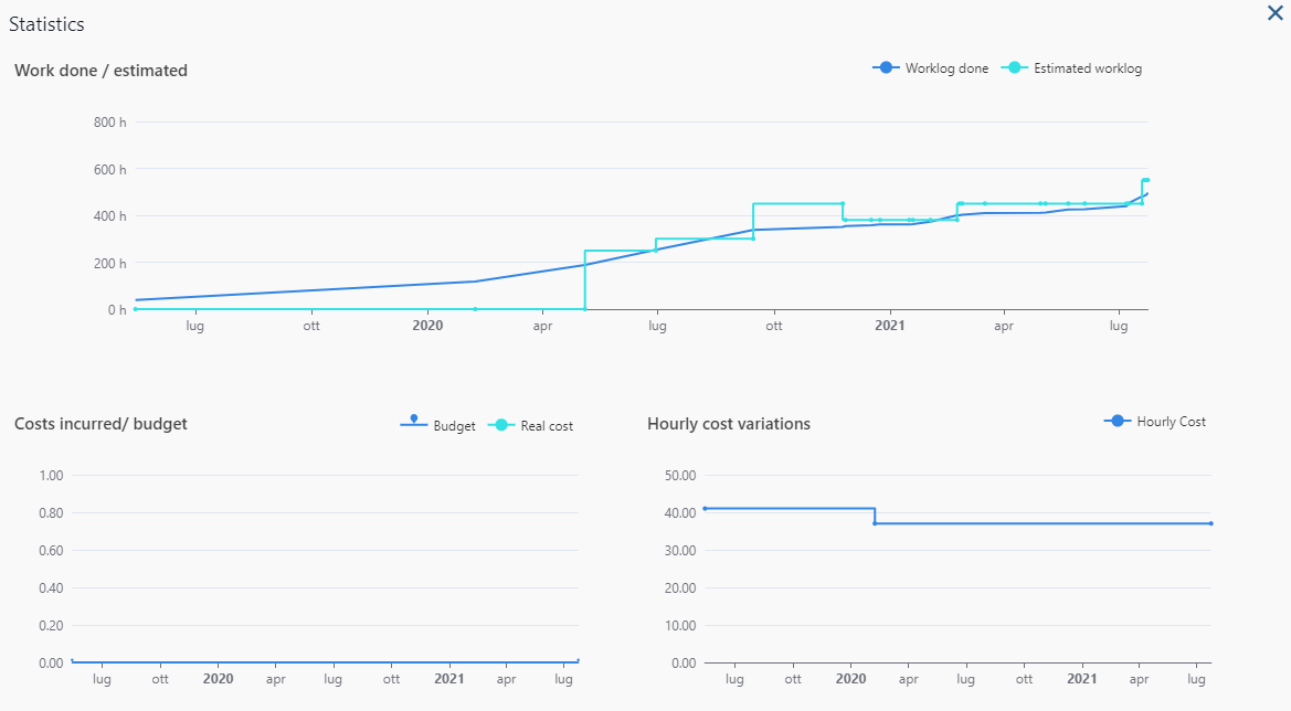 Statistics open a layer with all the statistics refereed to the assignments such as worklog done in time, expenses on budget and hourly cost variation in project period.