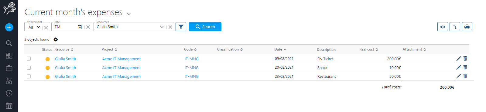 Expenses can be filtered by resource, project, period, type, cost, status, attachment, tags and description. The resulted list can be ordered and exported and show total costs.