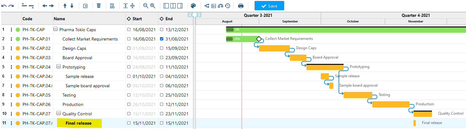 Your changes in the Gantt editor will be saved only when you click the “save” button. This way you can “play” with the tree without modifying the original project structure.