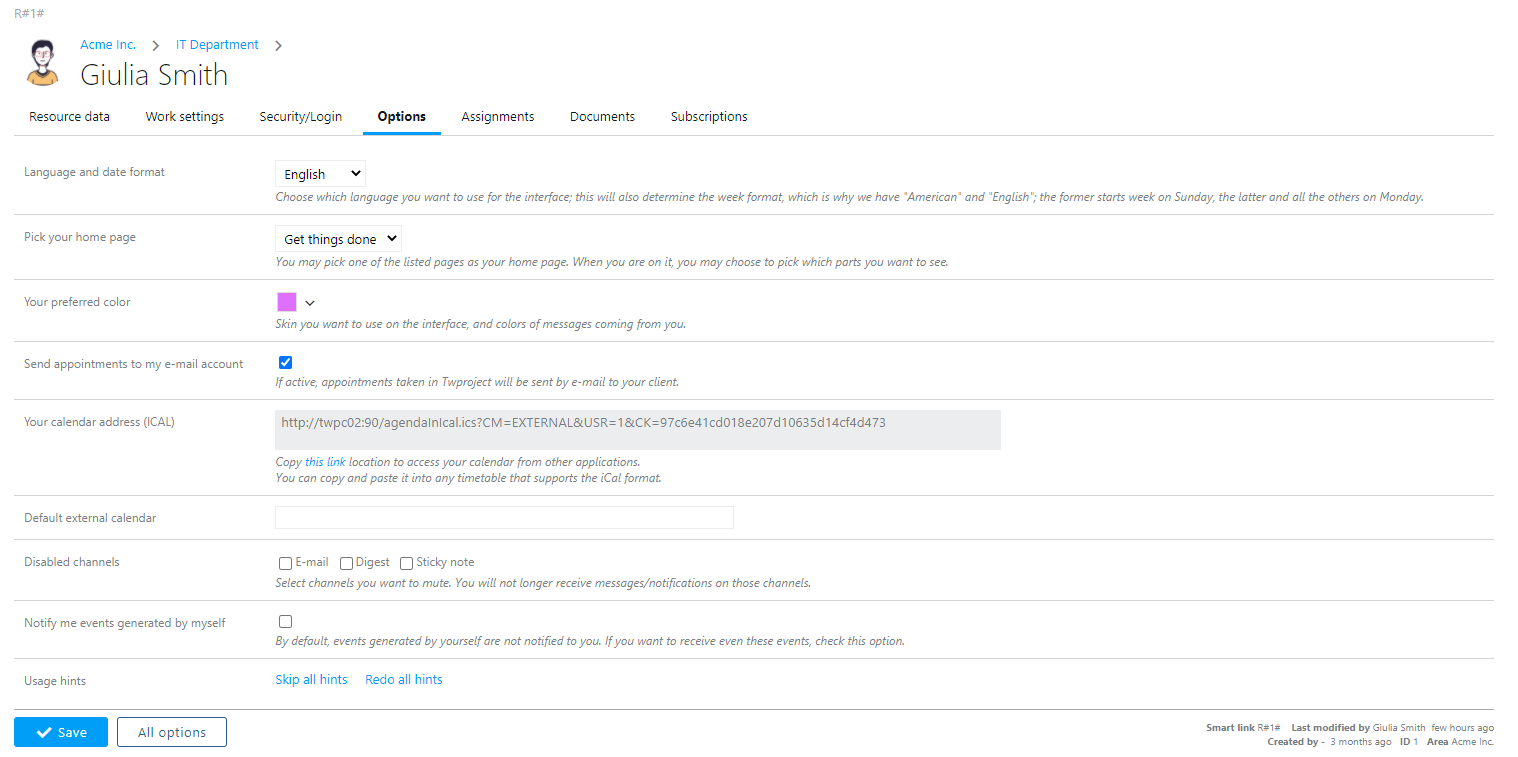 Every operator can customize Twproject’ behavior. Let’s have a look at the “options” tab: