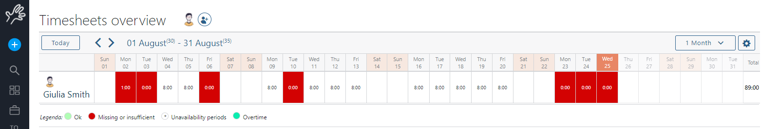 The legenda will tell you which days have insufficient, missing or too much work logs.