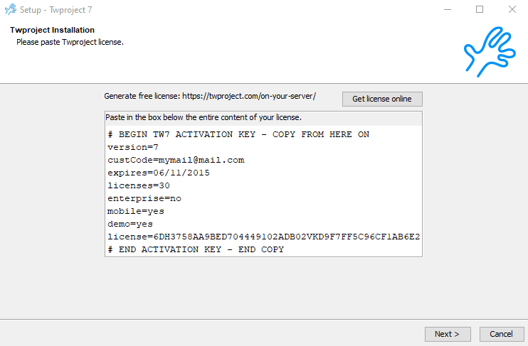 wait a few seconds, then insert the license you received from us or you generated from https://twproject.com/on-your-server/
