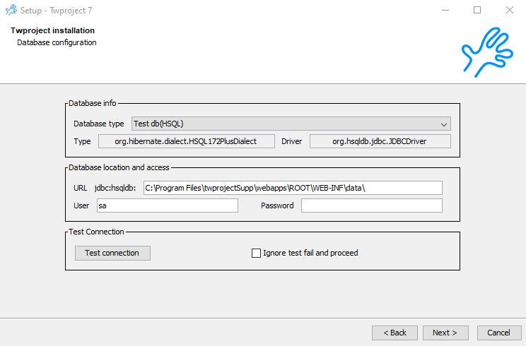 This is the easiest way to start with Twproject if you want to evaluate it. A default local database will be set up.
