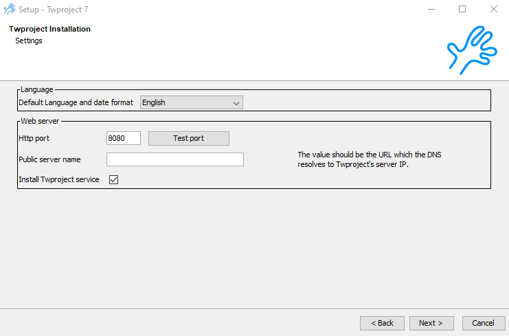 If you are installing Twproject using a public IP address or DNS name, you can specify it.