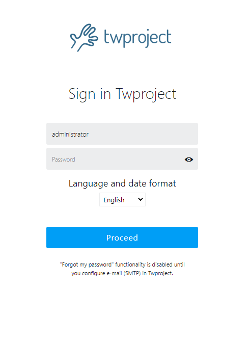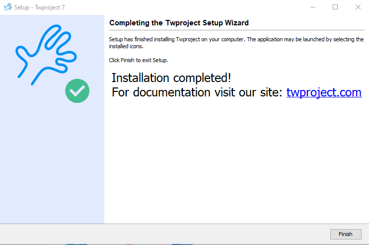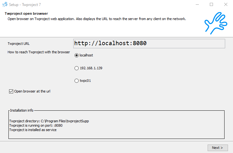 The installer tries to open the browser to the right location, and you can login Twproject for the first time: