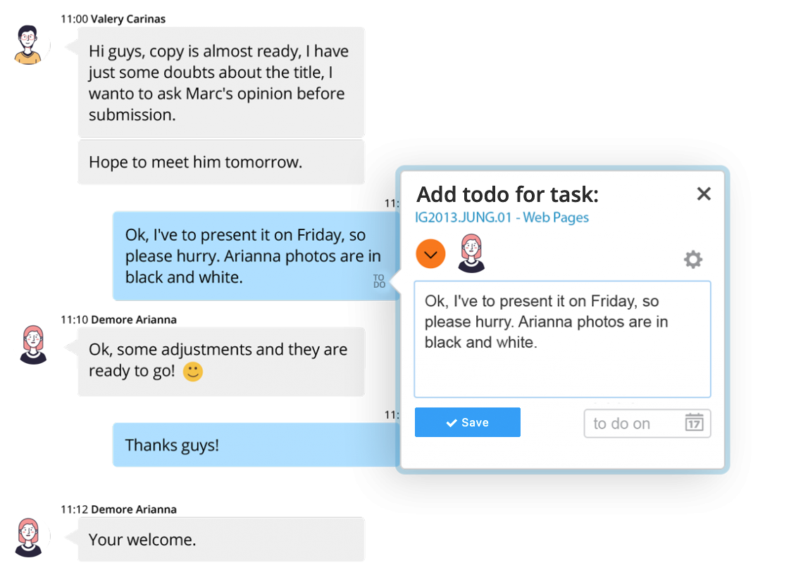 Communication within Twproject is immediate, share ideas and notes on your projects, useful links, images, mock-ups, to-dos; a dedicated chat is available on every project to promote team communication. Keep all your shared documents and ideas organized within your project and work together to get it done.