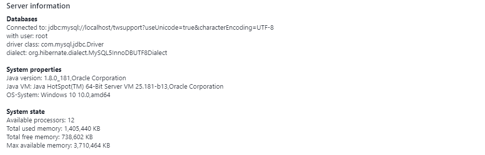 Information on DB, operating system, JVM and memory