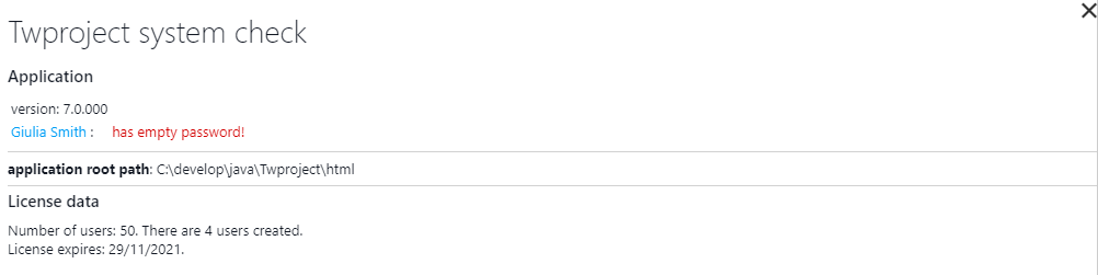 This page performs a check of system properties, user’s password, license; it may be useful to check your general Twproject status, and also communicate with us in case of support: