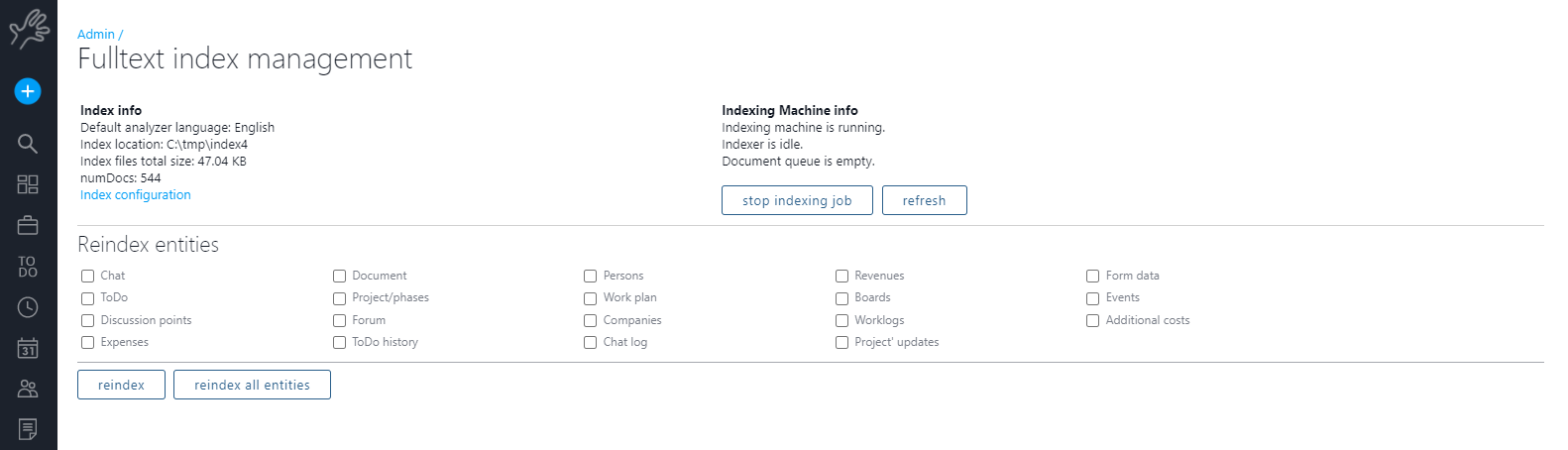 Here you can see the indexing machine status, stop the indexing job or force re-indexing.