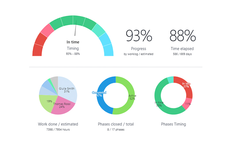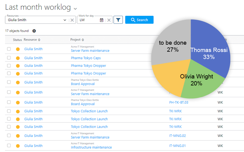 Twproject’s easy-to-use filter builder lets you quickly find your data and create reports. Need to see the status of all your projects at a glance? No problem. All worklog inserted for a period? For one of your client? By one specific team member? Easy. In Excel too.
