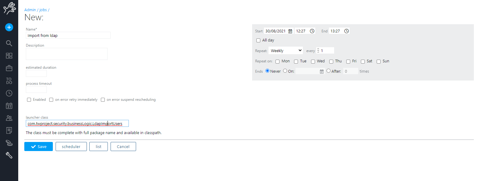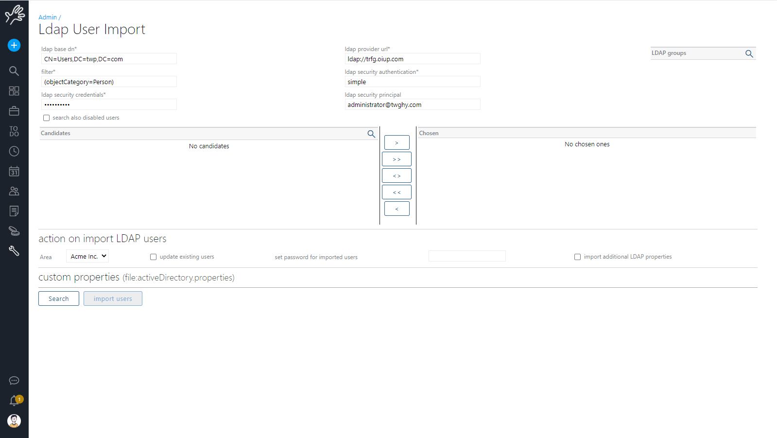 1) user import “by hand”: there is a procedure for importing users from an LDAP server (including Microsoft Active Directory ©), which may be used even if authentication through LDAP is not enabled; it is of course necessary if it is enabled, because the users in Twproject must exist in all cases.
