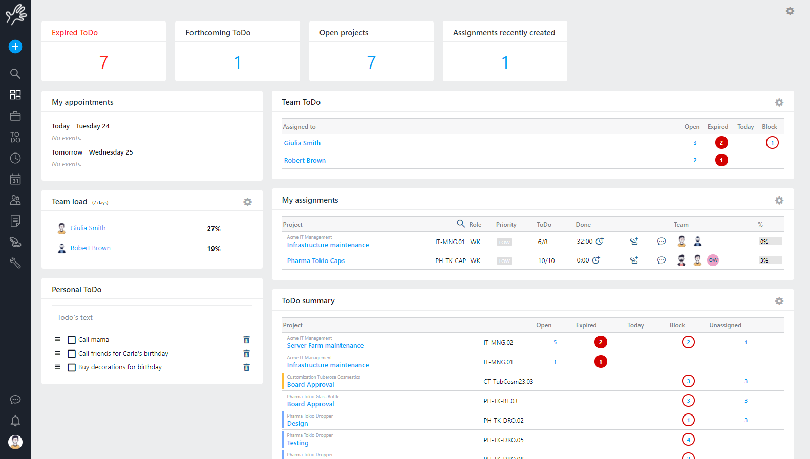 Ogni ToDo può essere assegnato a un utente, avere una scadenza, una priorità e uno stato (ad esempio, aperto, in corso, completato). In Twproject i ToDo sono sempre legati a un progetto o una fase.