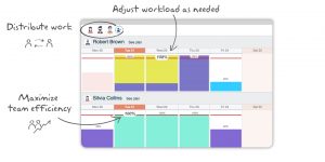 - Work done / estimated: shows the percentages of work done by each team member, compared to what remains to be done according to the schedule.