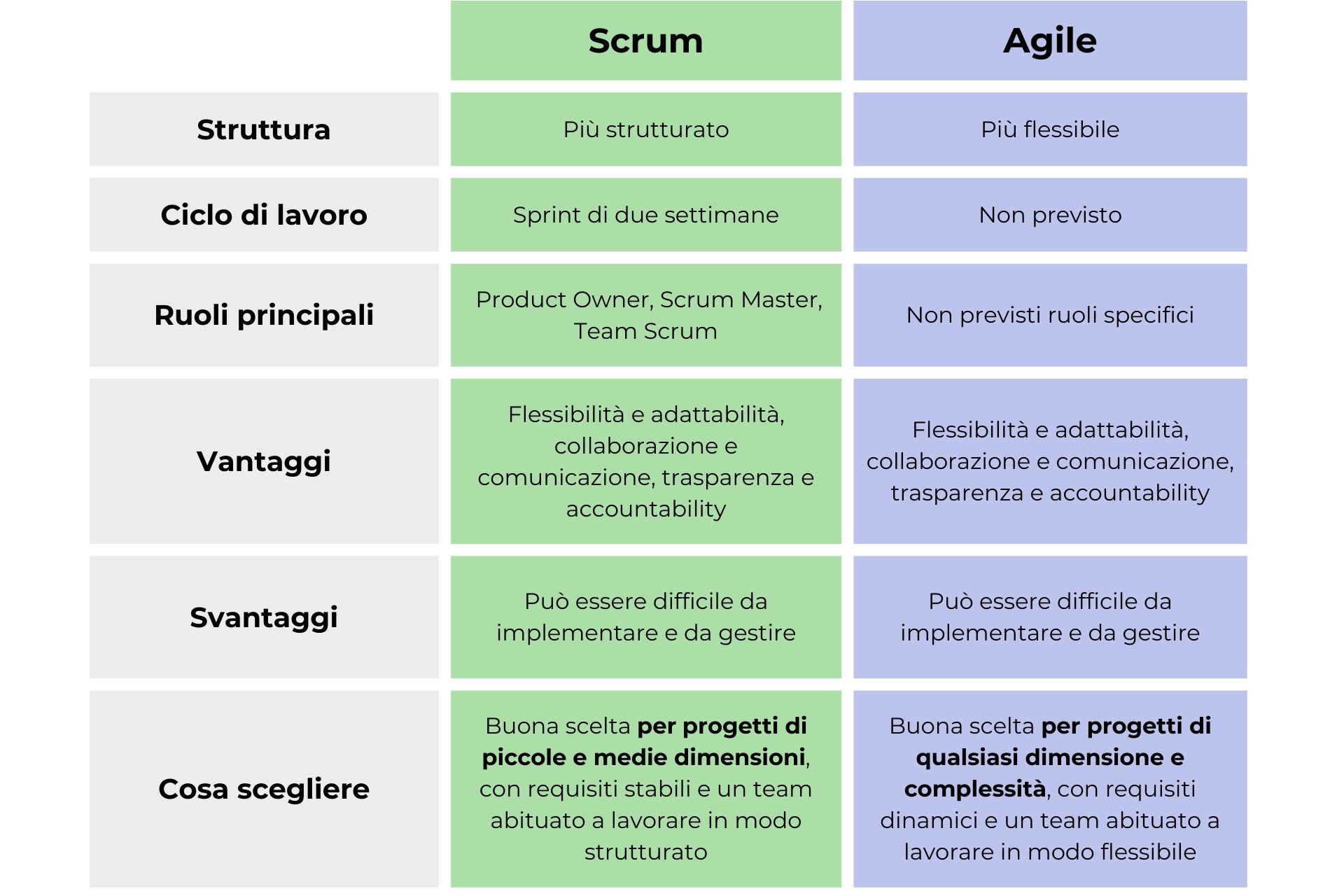 - Complessità del progetto: progetti con requisiti ben definiti e meno variabili si adattano bene ad Agile, mentre progetti complessi con molte incertezze possono beneficiare della struttura Scrum.