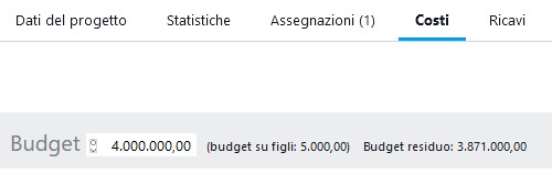 Per meglio orientarsi nella gestione finanziaria, Twproject mostra per ogni nodo il budget destinato a tutte le sue eventuali sotto-fasi, oltre al residuo ancora utilizzabile (valore dato dal budget sulla fase cui vengono sottratti quanto assegnato alle sotto-fasi ed i costi della fase stessa).