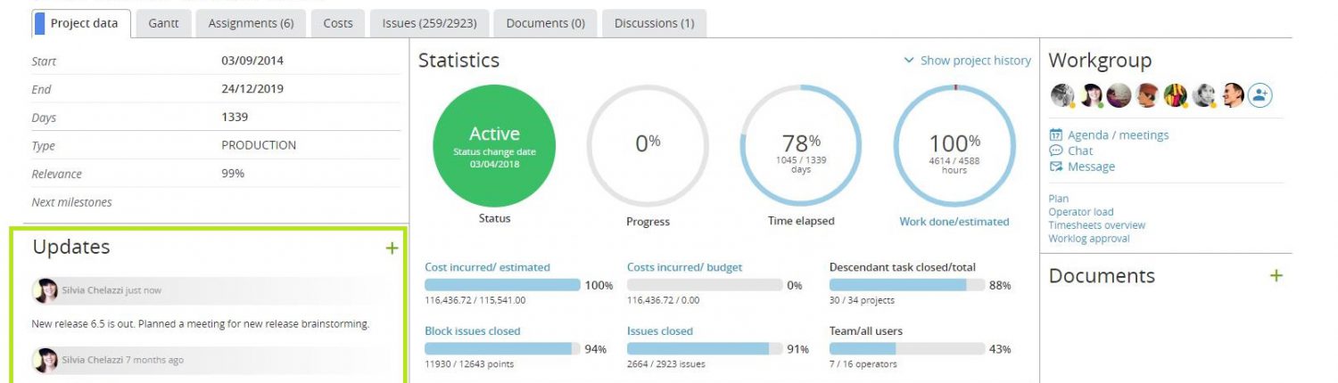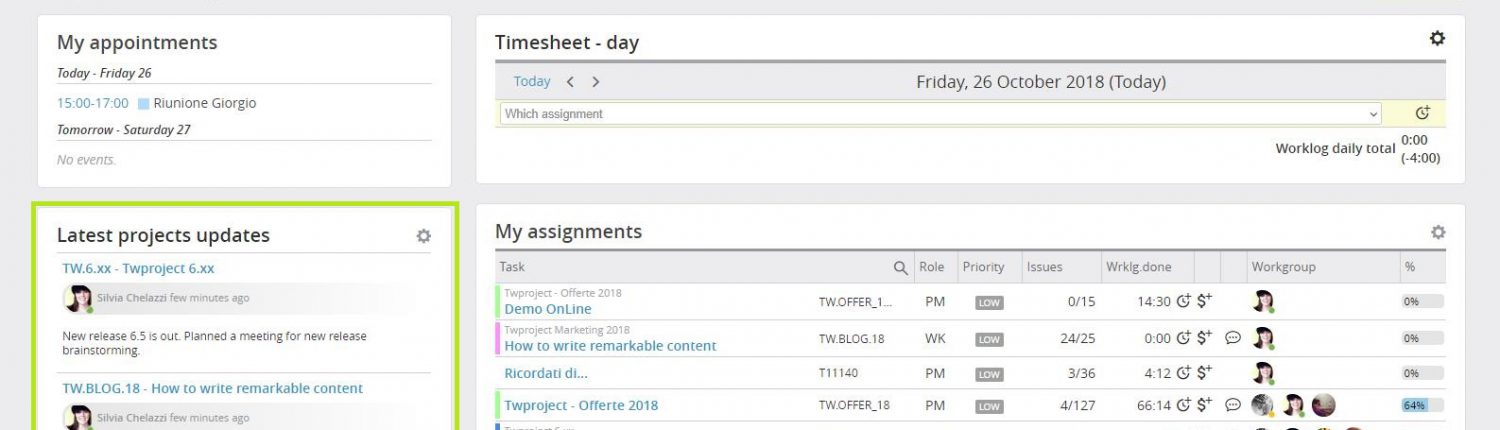 Gli aggiornamenti saranno visibili da tutti coloro che hanno i diritti di lettura sul task e accessibili dalla pagina del progetto, dal Gantt e anche dalla dashboard con una webpart dedicata.
